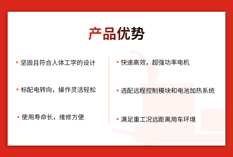 高速物流(liu)電動搬運車 産品(pin)賣點 堅固且符合(hé)人體工學的設計(ji) 标配電轉向,操作(zuo)靈活輕松 使用壽(shòu)命長,維修方便 快(kuai)🌈速,強功率點機 選(xuǎn)配遠程控制模塊(kuai)🤞和電池加熱系統(tǒng) 滿足✌️重工況遠距(ju)離👄用車環境
