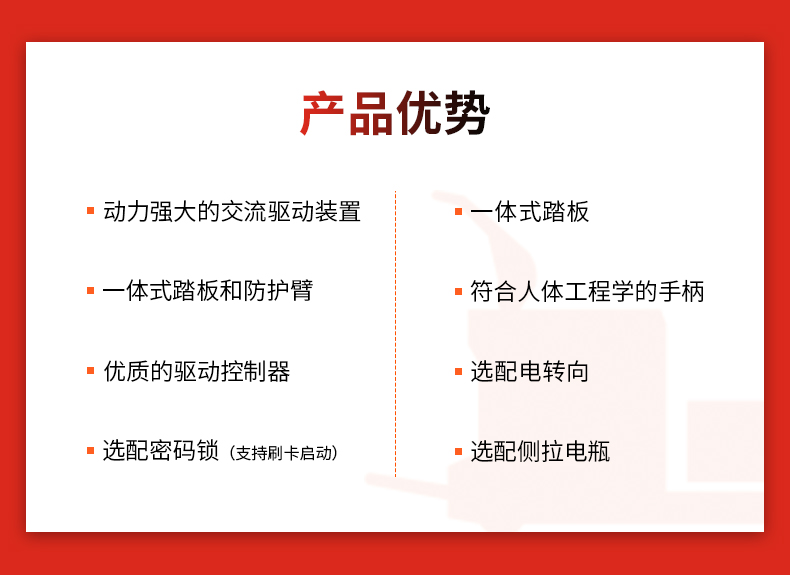 産品賣點 動力(li)強大的交流驅(qū)動裝置 一體式(shi)踏闆和防🙇🏻護臂(bì) 驅動控制器 選(xuan)配密碼鎖 一體(ti)式踏闆 符合人(ren)體工程學的手(shǒu)🌈柄 選配電轉向(xiàng) 選配側拉電瓶(ping)