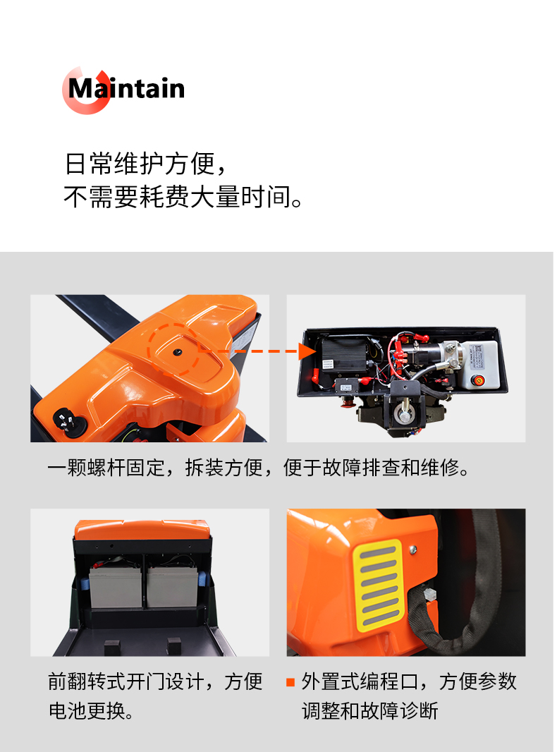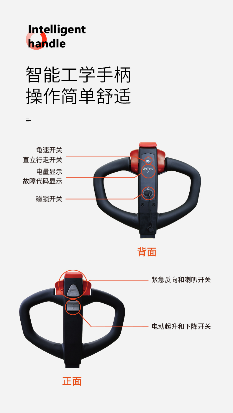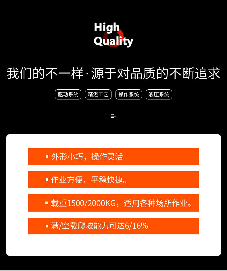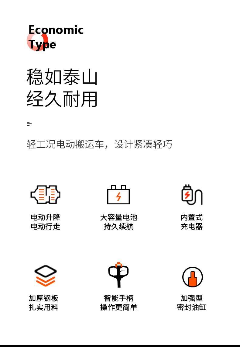 産品賣(mai)點 電動升(sheng)降 電動行(hang)走 大容量(liang)電池持久(jiǔ)續航 内置(zhì)式充電器(qi) 加厚鋼闆(pǎn)紮實用料(liao) 智能手柄(bing)操作更簡(jian)單 加強型(xing)密封油缸(gāng)