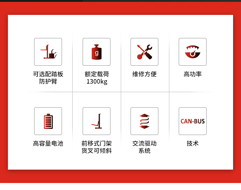 産(chǎn)品賣點 高(gao)容量電池(chi) 交流驅動(dòng)技術 貨叉(cha)可傾斜 選(xuan)♊配🌈側移功(gong)🌈能 選配側(cè)拉式電池(chi)