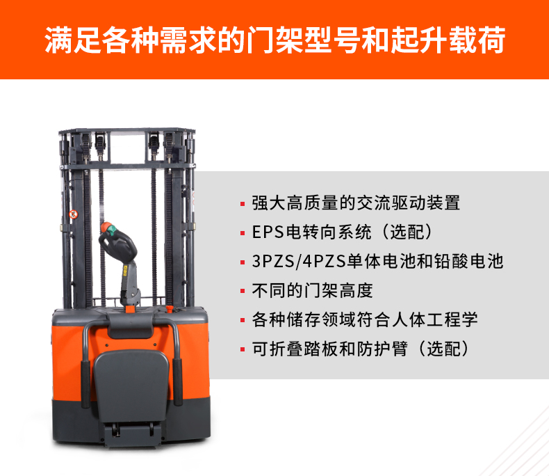 産品賣(mai)點 強大高質量的(de)交流驅動裝置 EPS電(dian)轉向系統(選🙇♀️配) 3pzs/4pzs電(dian)池單體或鉛酸電(dian)池 載荷1600kg的車輛電(diàn)池容量更高,工作(zuò)時間更🏃🏻長 不同的(de)門架高度 耐用并(bing)且符合人體工程(chéng)學的各🌈種存儲區(qū)域 PSB系列,多種門架(jià)🧑🏽🤝🧑🏻高度選擇
