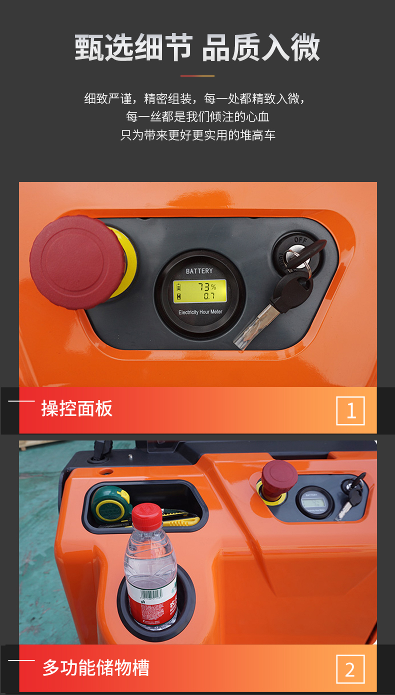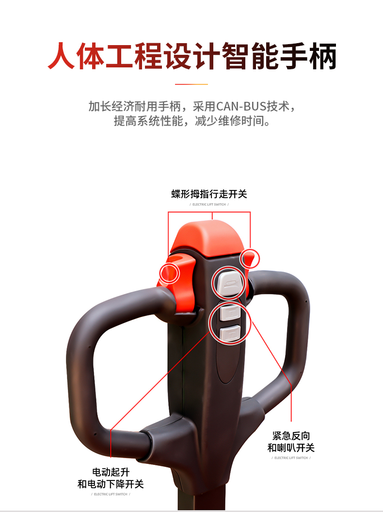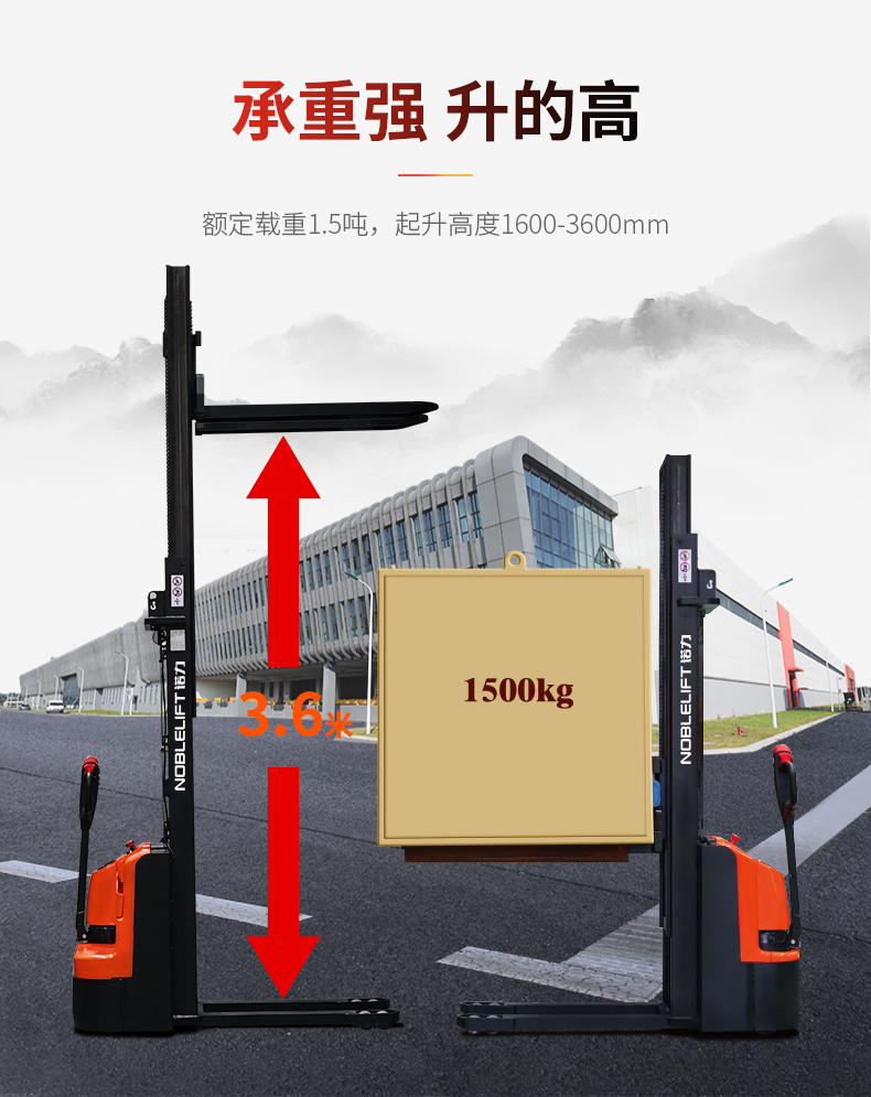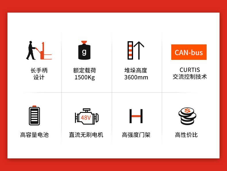 産品賣點(dian) 長手柄設計(ji) 額定載荷1500kg 堆(dui)垛高度3600mm CURTIS交流(liu)控制技術 高(gao)容量電池 直(zhi)流無刷電機(ji) 高強度門架(jia)