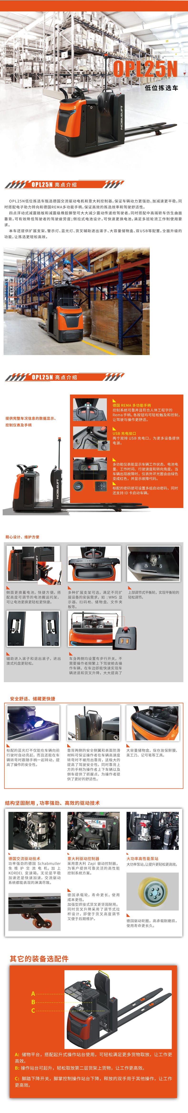 産品賣(mài)點 OPL25N低位揀(jian)選車甄選(xuan)德國交流(liú)驅動電機(ji)和意大利(li)控制器,車(che)輛動力更(geng)強勁、加減(jiǎn)速更平穩(wen),同☀️時搭配(pèi)電子助力(li)轉🥰向和德(dé)國REMA多功能(neng)手柄,揀選(xuǎn)效率和駕(jia)✔️駛舒适性(xìng)。 四點浮動(dong)式🧑🏽🤝🧑🏻減震踏(tà)闆和減震(zhèn)級橡膠腳(jiǎo)墊可大大(dà)減🔆少震動(dong)傳遞給駕(jia)駛者,同時(shí)搭🔅配中轎(jiao)車仿生曲(qu)面靠背,可(ke)有效降低(di)駕駛者的(de)駕✊駛疲勞(lao)度;側拉⭐式(shi)電池設計(jì),可快速更(gèng)換電池,滿(man)足多班輪(lun)流工作制(zhi)使用要🏃求(qiú)。 本車還提(ti)供擴展支(zhī)架、警示燈(deng)、藍光燈、貨(huo)叉輔助進(jin)出滾子、大(da)容量儲物(wu)盒、雙USB等配(pei)置,全面升(shēng)級的功能(néng),讓揀選更(geng)輕松。