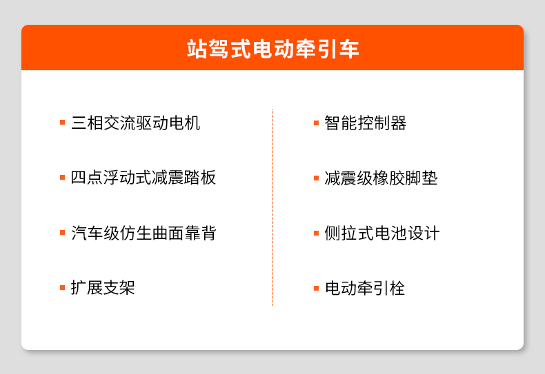 産(chan)品賣點 載(zǎi)荷牽引:3/5t 額(e)定牽引力(li):800/1000N 行駛速度(du)(滿載/空載(zai)):6/9、7/12km/h 驅動🚶♀️單元(yuán):1.9/2.6kw 标配24V375/465Ah鉛酸(suan)電池